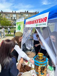 5 мая на площадке мемориального комплекса «Аллея Победителей» в Комсомольском парке города Пятигорска, кооператив «Содействие» развернул для своих пайщиков, жителей и гостей города — ПОЛЕВУЮ КУХНЮ. Всех желающих угощали вкусной, горячей кашей с тушёнкой и ломтиком чёрного хлеба, наливали чай с лимоном и баранками.